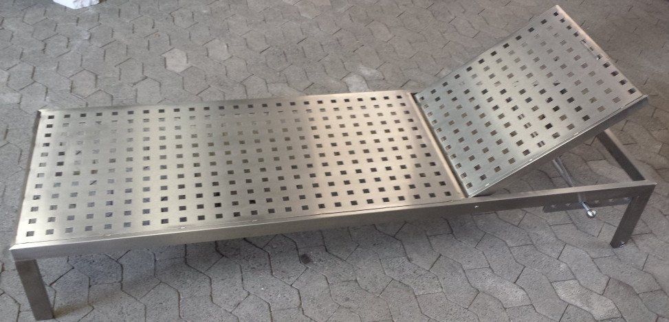 Edelstahlliege mit höhenverstellbarem Kopfteil. Liegfläche aus geschliffenem Lochblech.